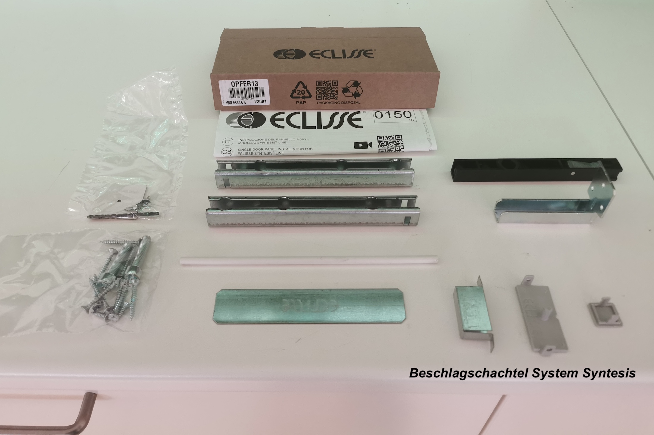 Die Beschlagschachtel ist im Kaufpreis des Unico/Syntesis Kastens inkludiert und wird automatisch mitgeliefert. Sollte die Beschlagschachtel auf der Baustelle verloren gehen, kann das Set hier günstig nachbestellt werden. Dast Set gibt es in 3 Varianten passend zu dem bei dir verwendeten Schiebetürsystem.