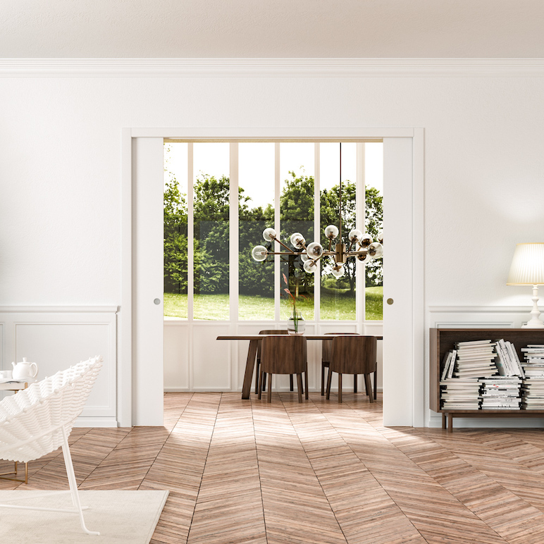 Der Eclisse Schiebetürkasten Unico DF ist ein Schiebetüreinbauelement in zweiflügeliger Ausführung für Ständerwandkonstruktionen.