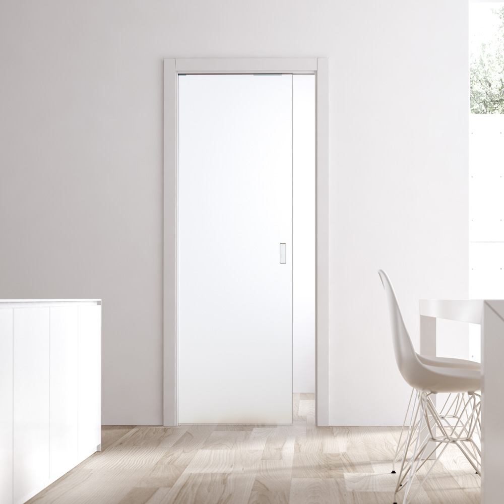 Die Eclisse Stockverkleidung ist eine geteilte Türzarge aus Holz die für einen sauberen Abschluss des Schiebetürkastens zum Glastürblatt sorgt.