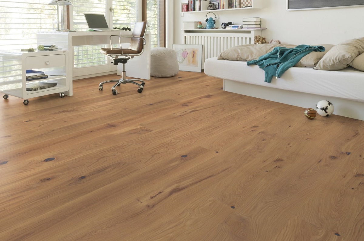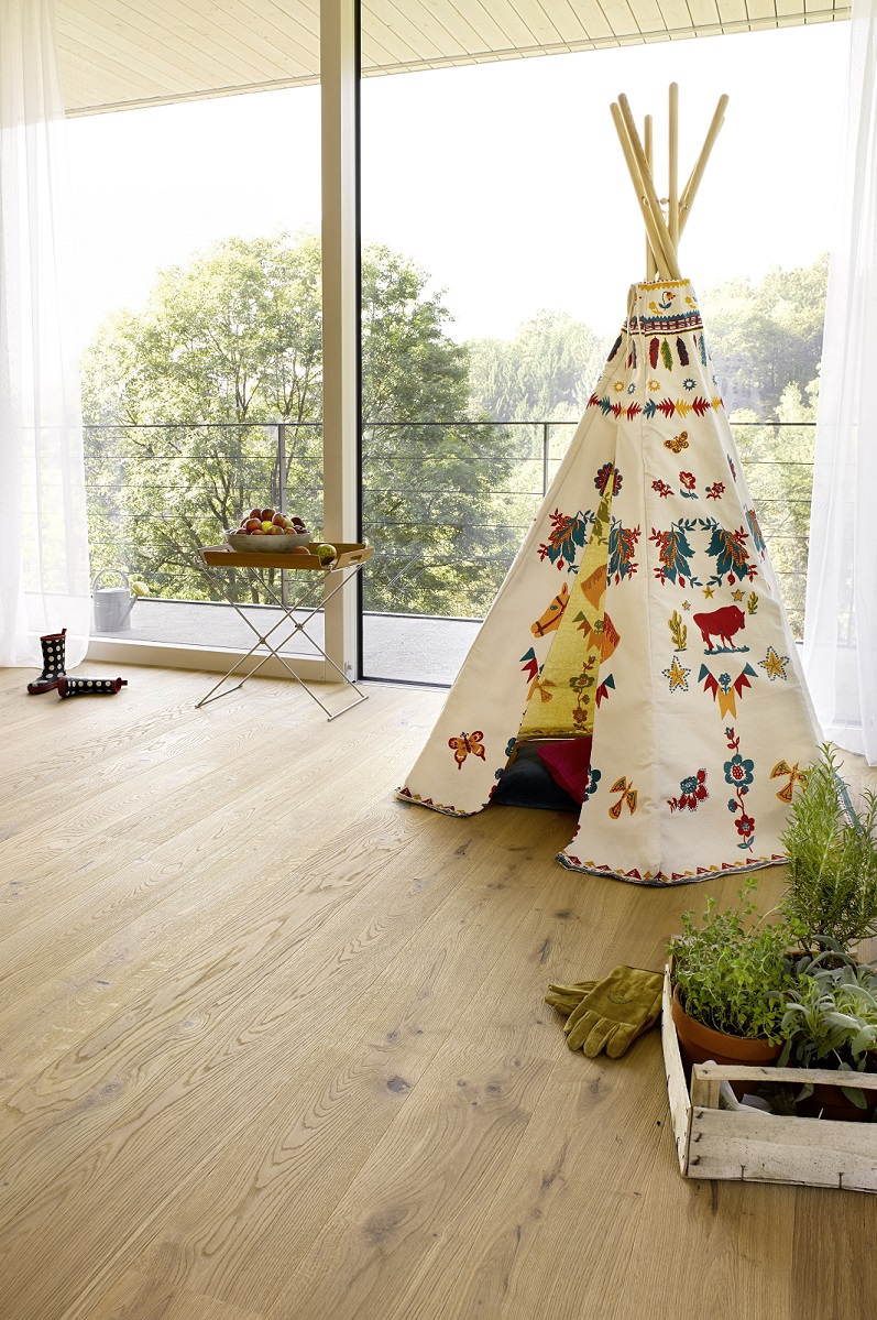 Die hochwertige Tilo Landhausdiele Eiche Impuls Almond ist ein klassischer Eichenboden mit gebürsteter und geölter Oberfläche.